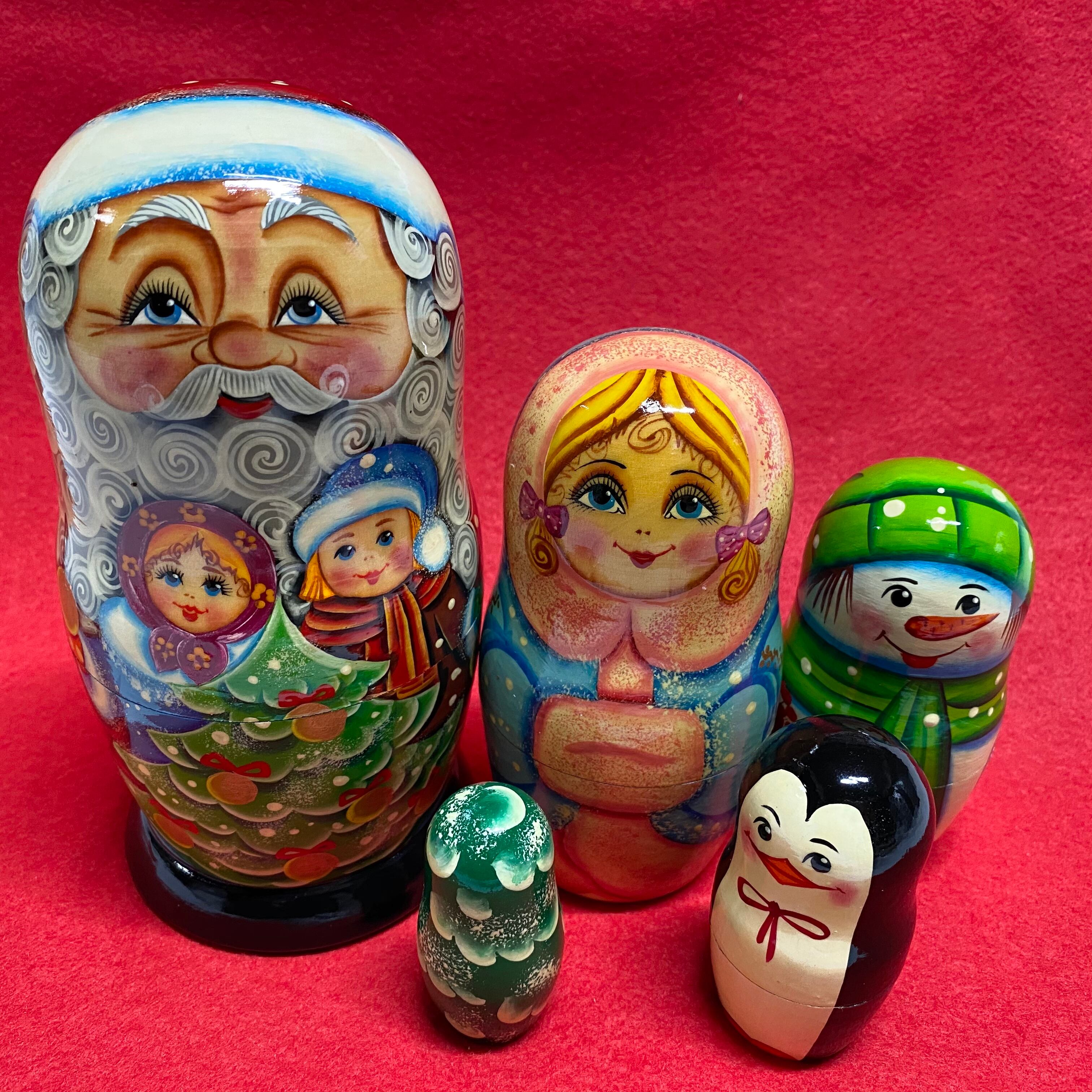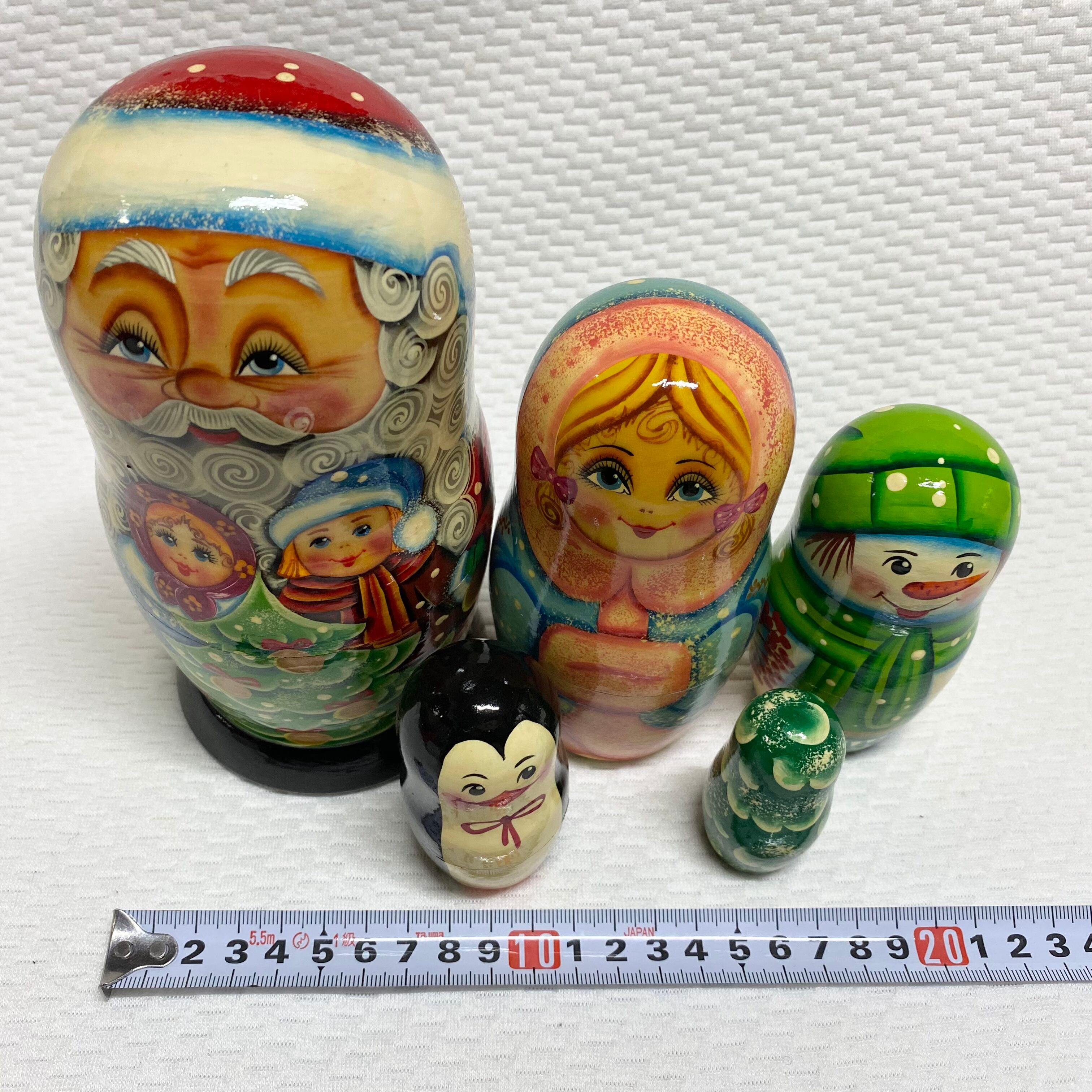 高さ約18cm のジェドマロース(ロシアのサンタ)の中にはお供のスネグロチカ、スノーマン、ペンギンさんとツリーが入り、計5個。