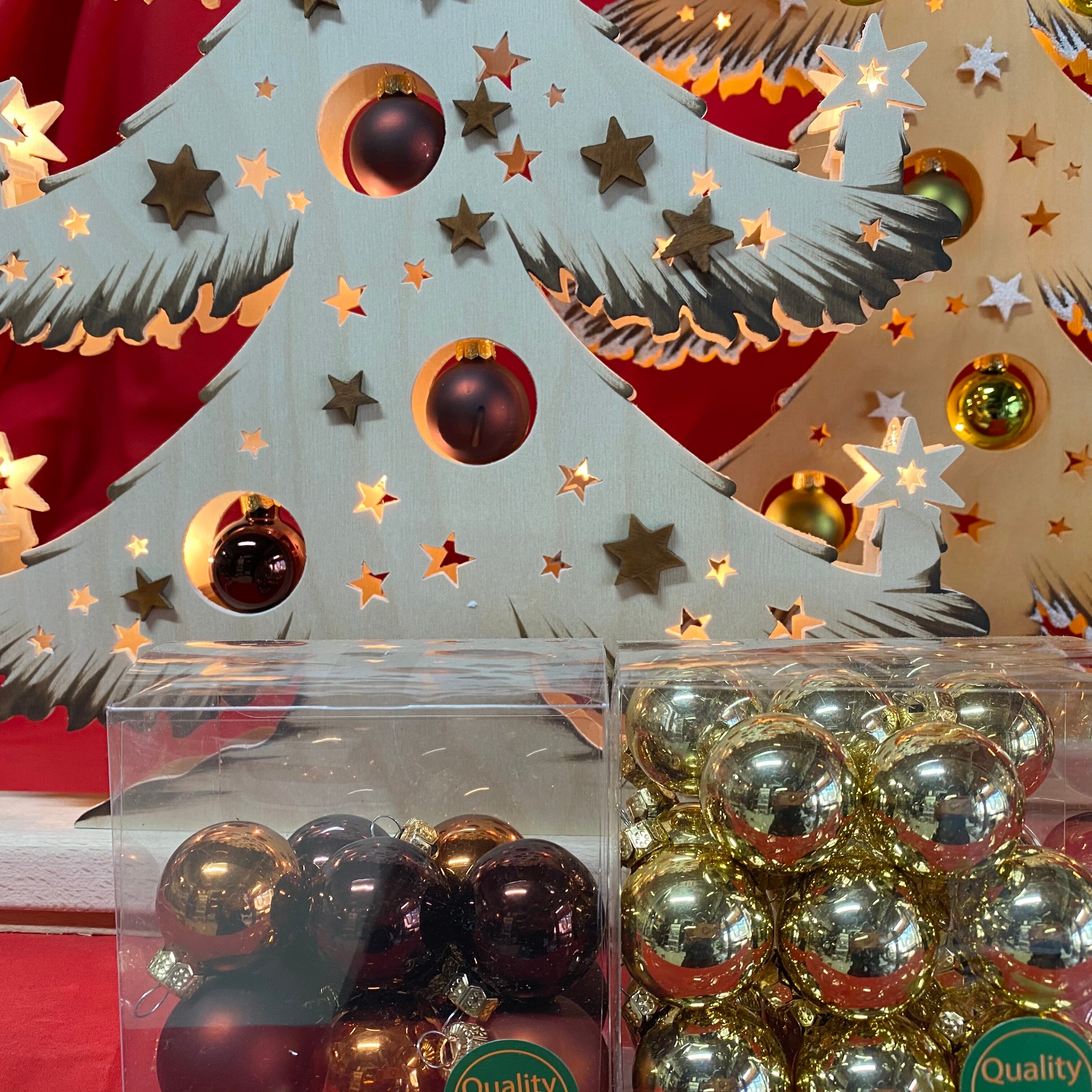 もう一種類、同サイズのツリーは、雪がかかってボールがグリーンとホワイトのバージョンあり。どちらがお好み?